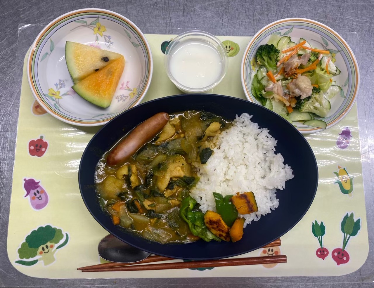 8月14日(木) チキンと夏野菜のカレーライス、サラダ、ミルクゼリー ![]() |