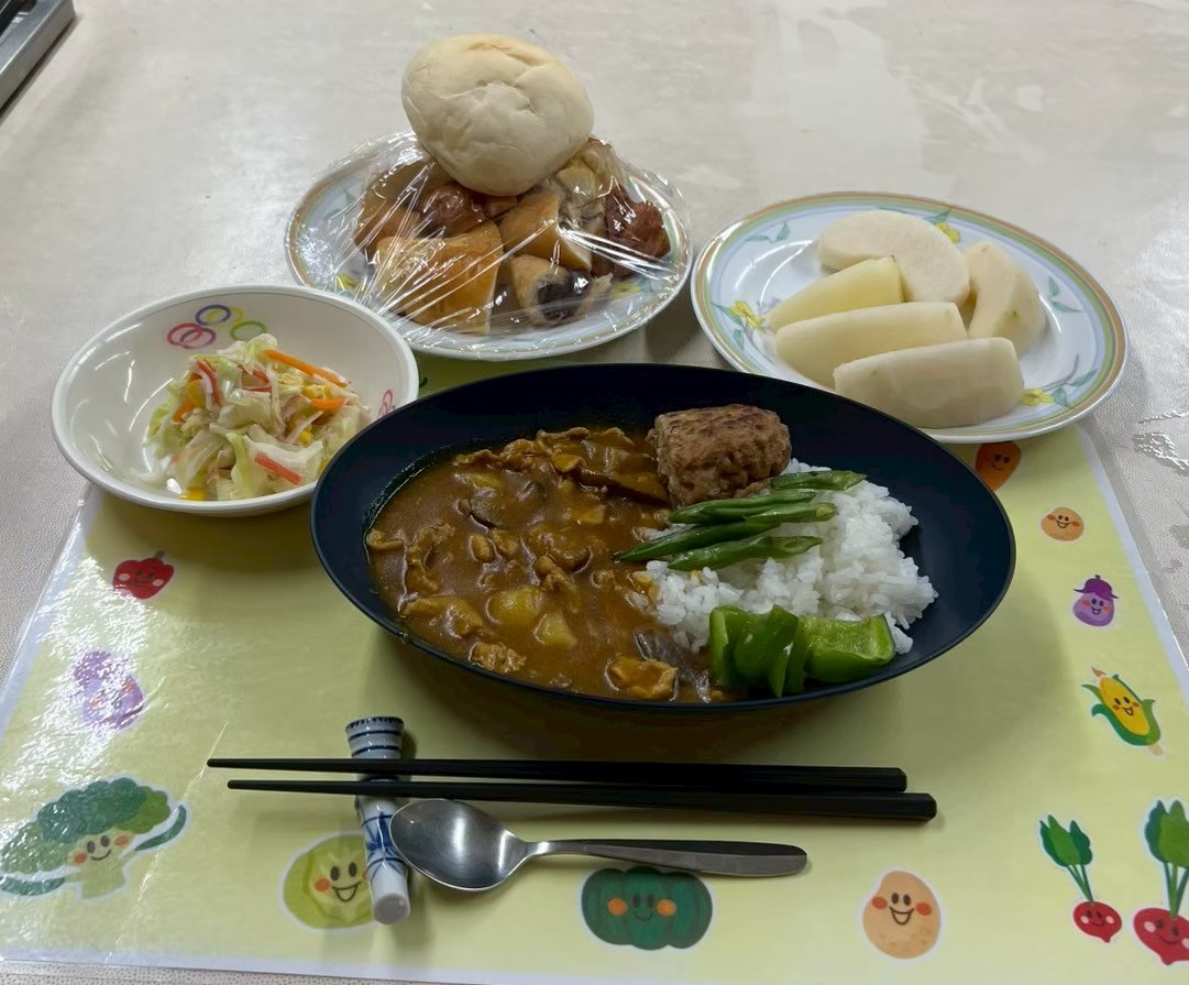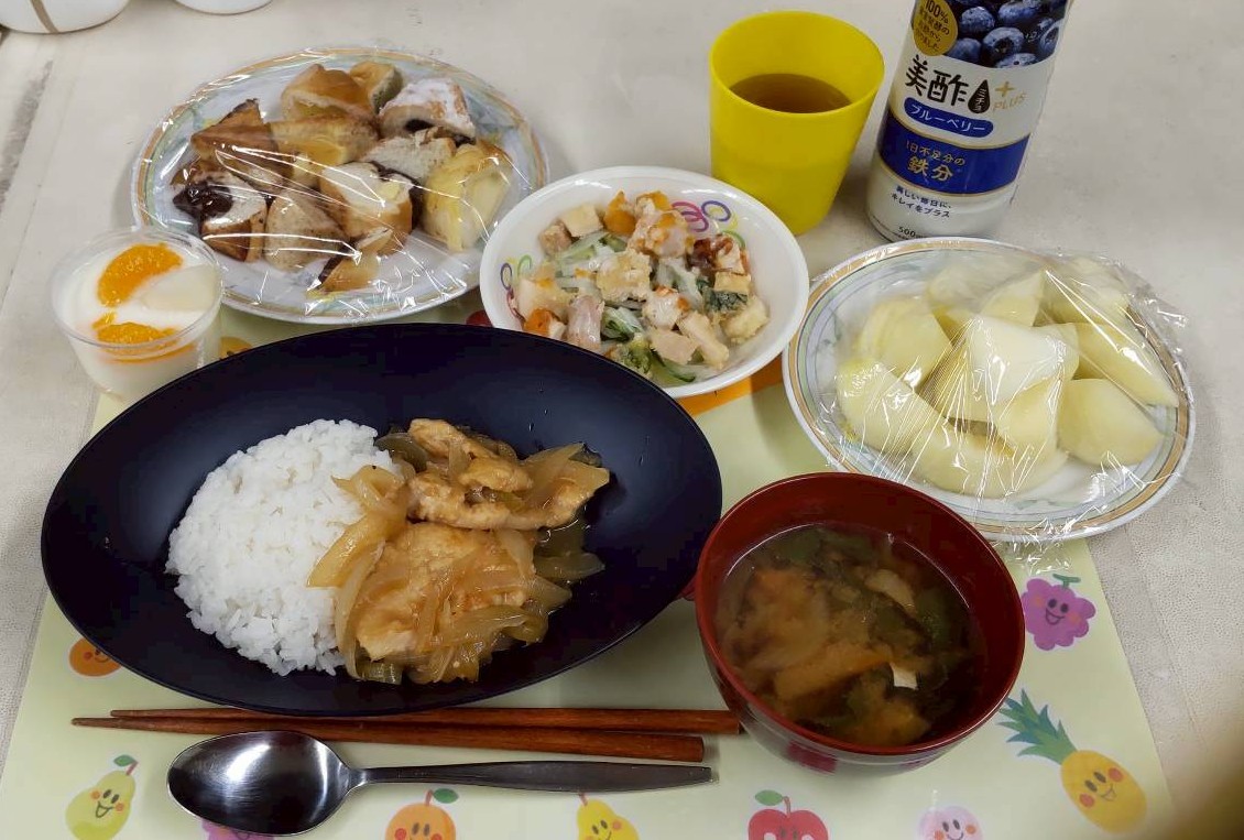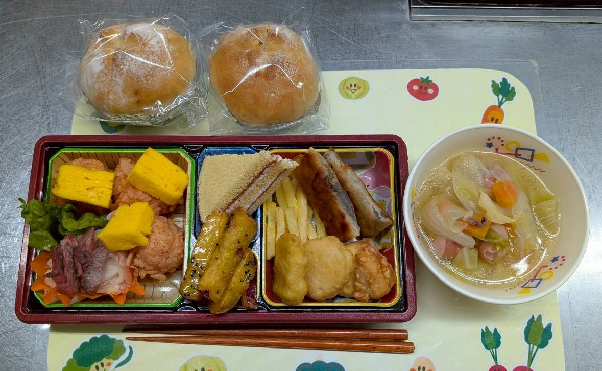 | 【今後のメニュー(予定)】食材の都合等により、変更になる場合があります。 ◎2月18日(木) ご飯、お味噌汁、豚生姜焼き野菜添え、チーズじゃがもち、大学芋 ◎2月26日(木) ご飯、お味噌汁、豚生姜焼き野菜添え、今川焼き、フルーツヨーグルト ◎3月12日(木)26日(木) ガパオライスふわ玉乗せ、温野菜or野菜サラダ、サツマスティック、フルーツポンチ |