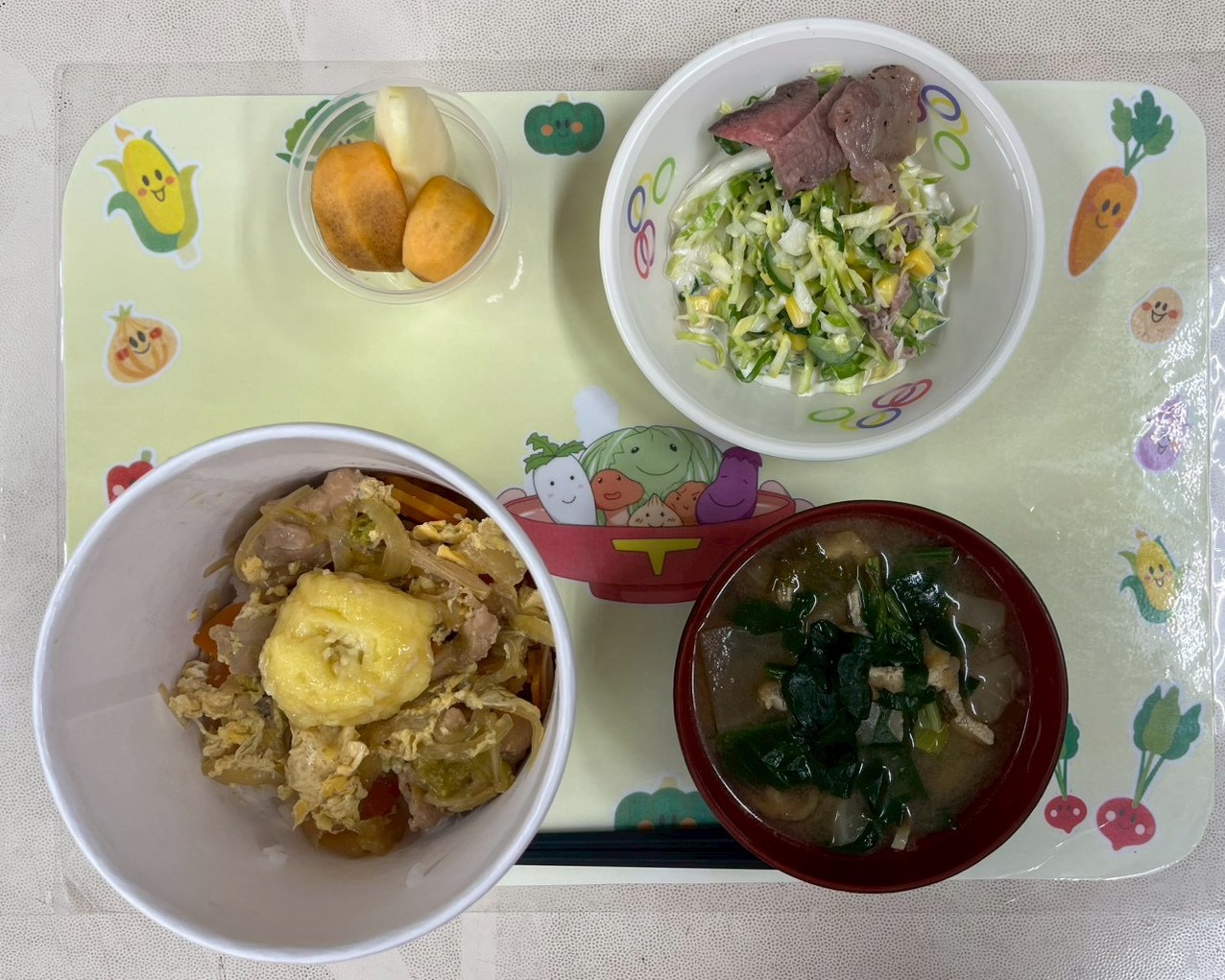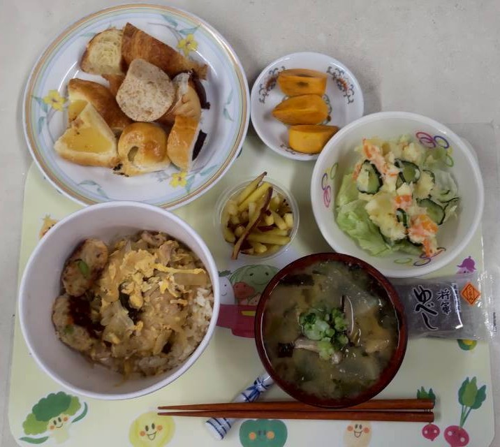 11月27日(木) 秋の野菜たっぷり親子丼、みそ汁、さつまいもの塩バター炒め、サラダ ![]() |