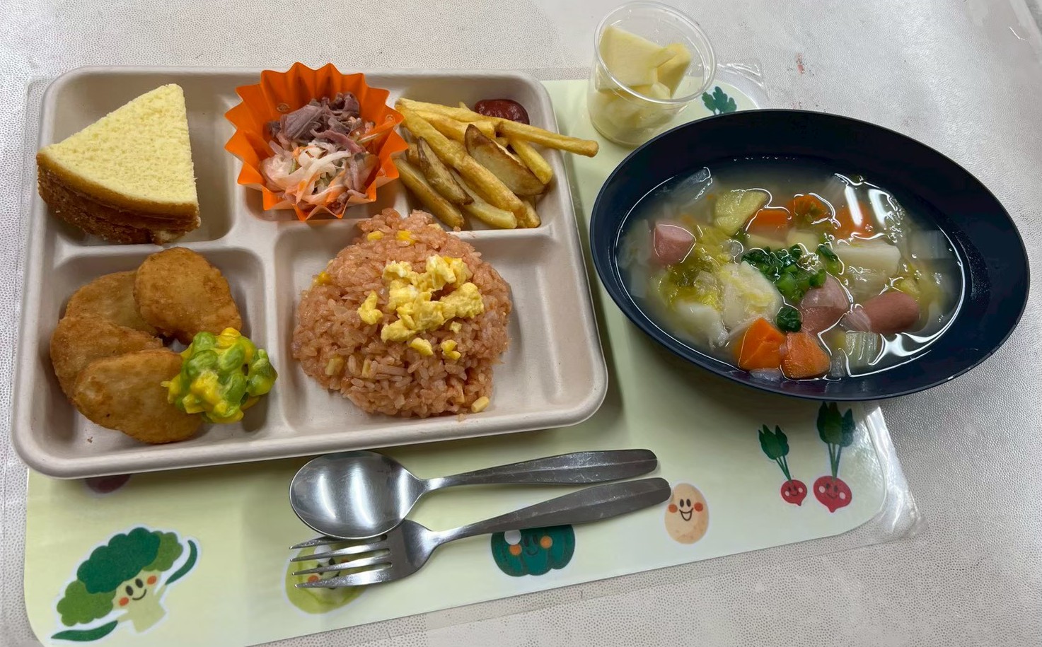 | 12月11日(木) ケチャップライス、ポトフ、チキンナゲット、サラダ、プチケーキ、ジュース ![]() |