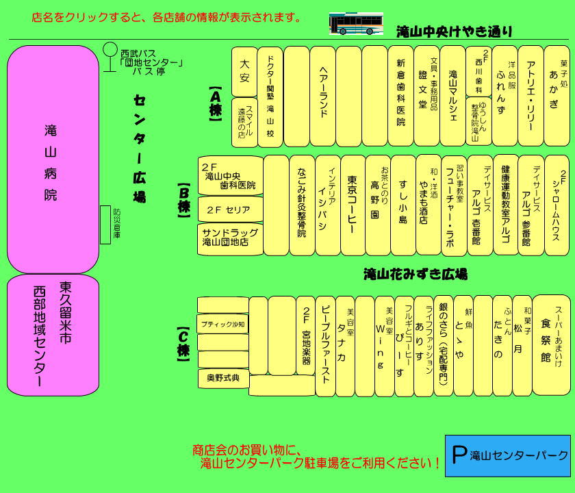 私たちは、東京都東久留米市西部に位置する「滝山中央名店会」です。